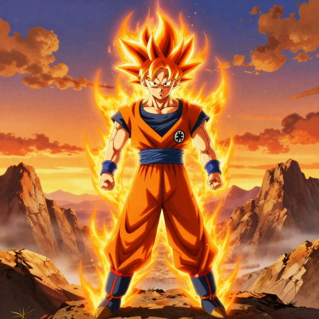 Goku orange hair blazing in a fiery aura, standing on a rocky mountainside at sunset, vibrant orange tones illuminating his spiky hair, intense energy radiating from him in an epic anime style, dynamic and powerful composition.