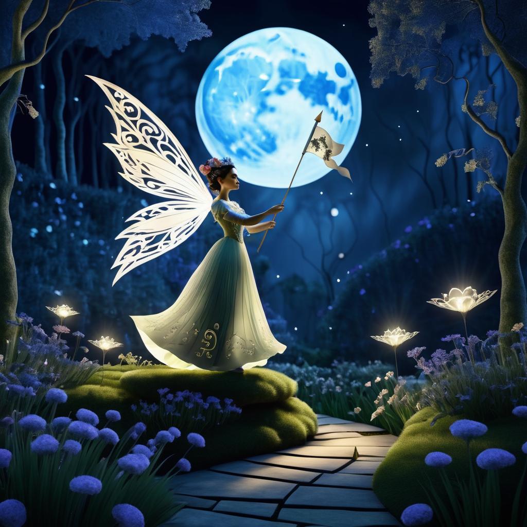 A transforming fairy stands in a moonlit mystical garden surrounded by glowing flowers and dark trees. She wears a flowing blue dress with intricate wings and a floral crown, holding a flagpole topped with a bright moon. The enchanted night scene blends fantasy and psychological themes in a detailed 3D render style.