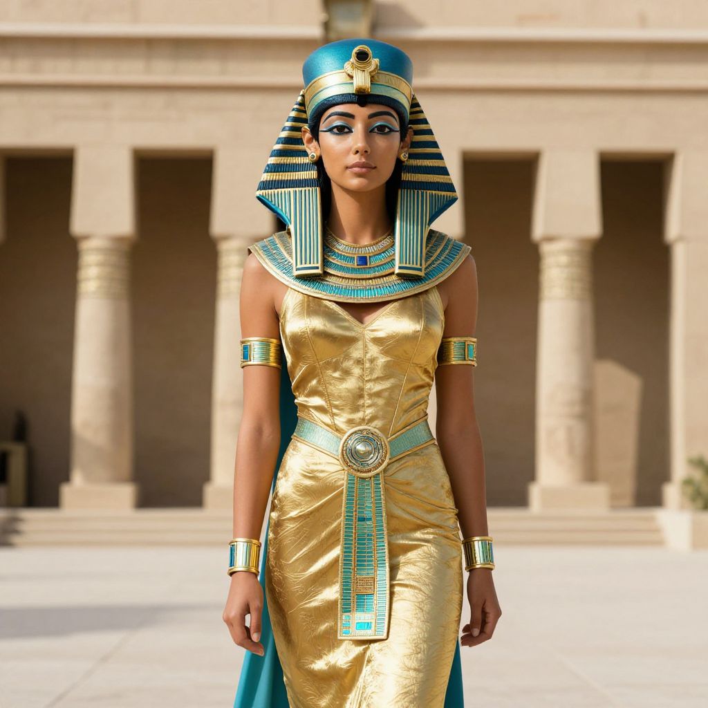 Digital artwork of a brown-skinned woman in an Egyptian-style gold dress and blue-and-black striped headdress, standing in front of ancient stone columns.
