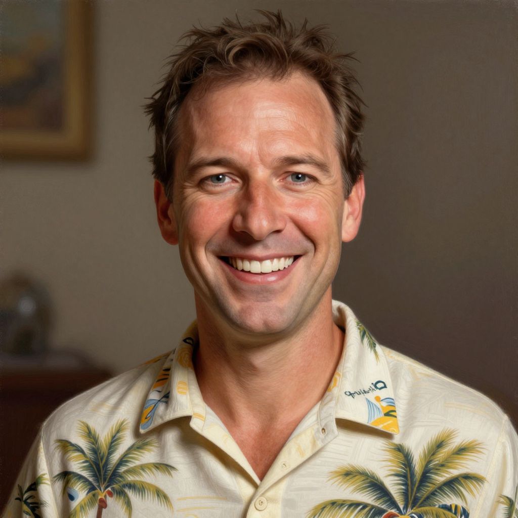 John oliver caricature, smiling, highly detailed, digital painting, artstation, sharp focus, illustration, with hawaiian shirt, art by greg rutkowski, norman rockwell and alphonse mucha