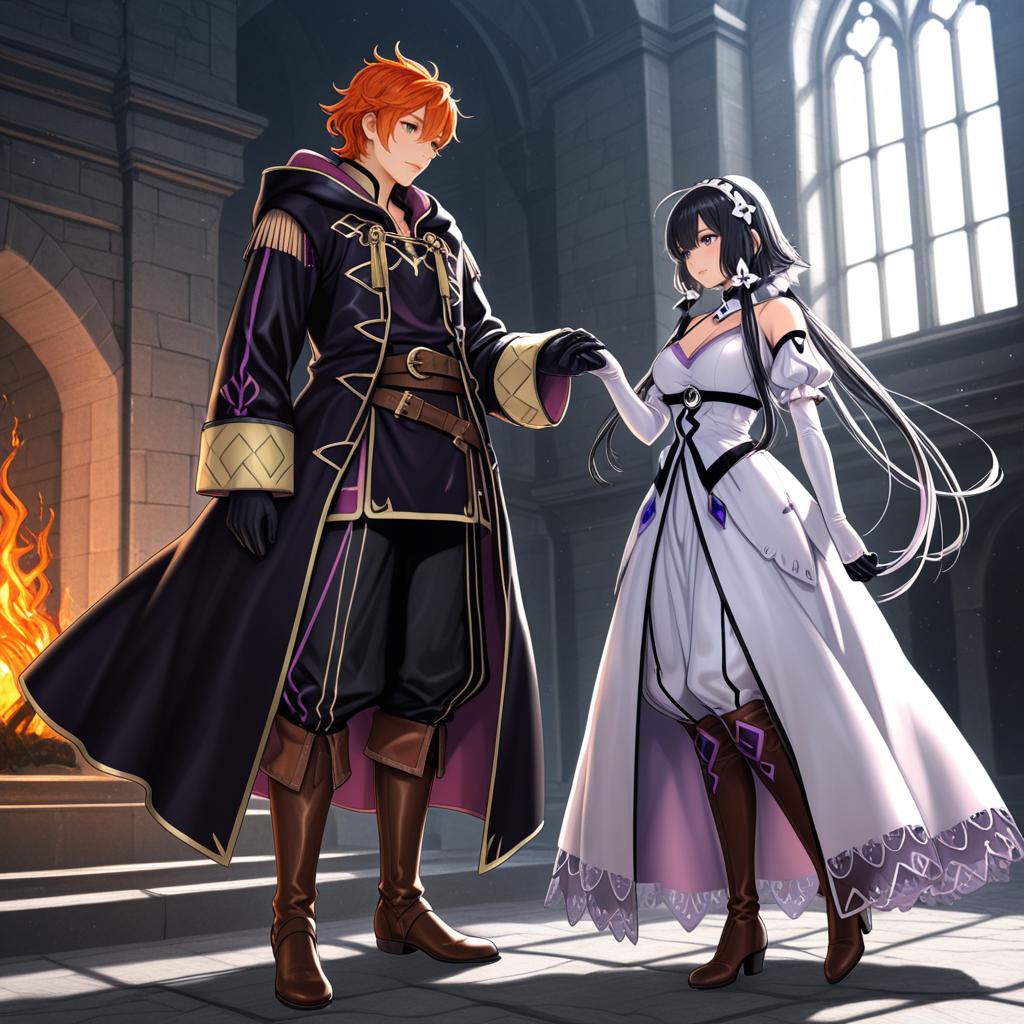 Digital artwork featuring a fantasy male and female character in a large stone castle interior with tall windows. The male character has short red hair, wears a detailed black and purple long coat with gold trim, puffy pants, brown knee-high boots, and black gloves. The female character has long black hair, purple eyes, and is dressed in an elegant white gown with black and purple details, long gloves, and brown heeled boots. They stand holding hands near a warm fireplace under soft natural light.