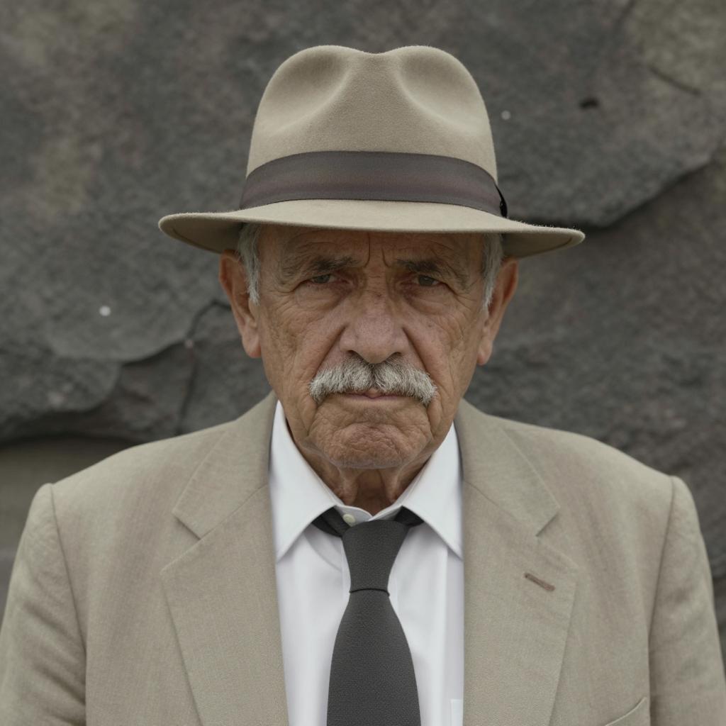 Middle-aged man with wet, dirty face, gray hair, and wrinkled skin, wearing a gray shirt and dark jacket, leaning against a rough, brown wall. Lifebuoy with orange and white stripes is mounted on the wall to his right. Man's expression is serious and focused. Dim, natural light. Photorealistic style.