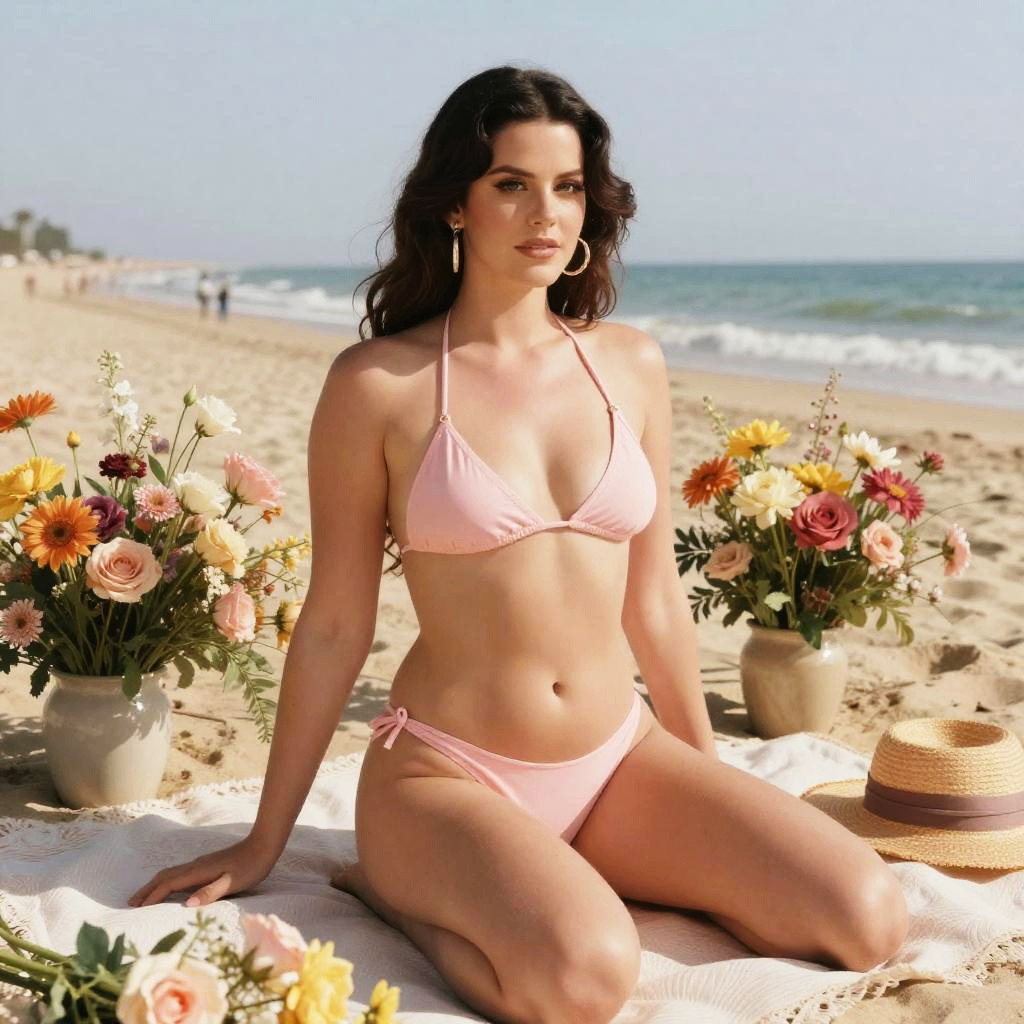 Lana Del Rey in bikini walking along a deserted sandy shore, wind softly blowing, ethereal glow, muted color palette, a mix of melancholy and beauty, cinematic background