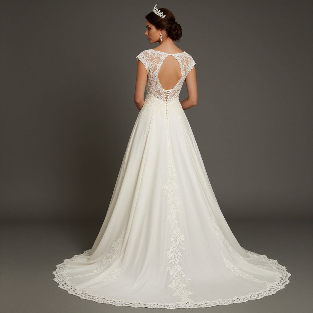 Elegant bride showcasing a stunning ivory A-line wedding dress featuring a delicate lace-up back, sheer lace detailing, and a flowing tea-length skirt with a scalloped hem, complemented by a sparkling tiara and dangling earrings.