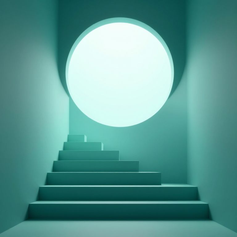 A minimalist 3D-rendered staircase ascends gracefully toward a luminous circular opening, casting soft shadows on the smooth, teal walls, evoking a serene and futuristic ambiance reminiscent of modern architectural design.