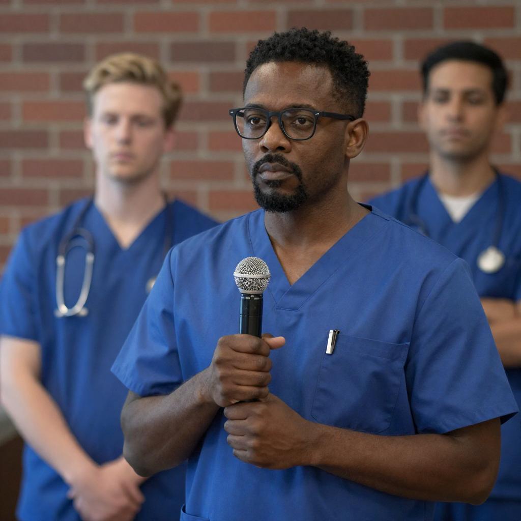 Photograph of two men sitting on a concrete curb. Left man with dark hair, beard, wearing dark blue uniform, holding French bulldog leash. Right man with short black hair, beard, glasses, wearing turquoise scrubs, white sneakers. French bulldog with white coat, black mask, red collar. Grass and pathway in background. Both men looking forward. Right man's hands clasped, left man's arm resting on knee.