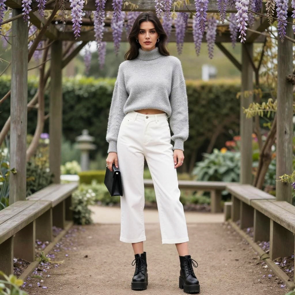 A woman, in a minimalist style, wearing a light grey cropped mock neck sweater and white high-waisted culottes, black lace-up platform boots, holding a small black clutch, standing in a lush botanical garden under the wisteria arbor. Sexy. Pretty face and beutiful eyes