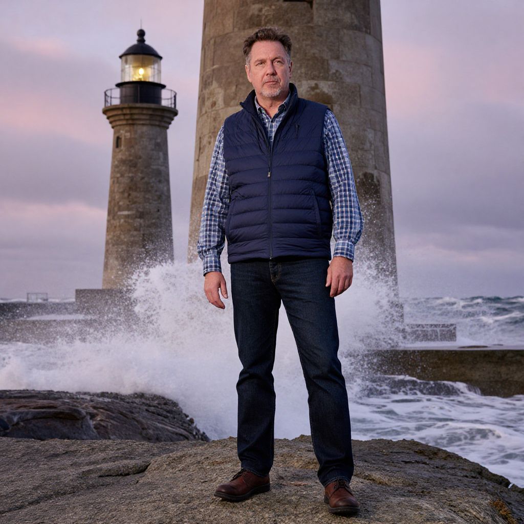 A photograph of a middle-aged man standing in front of a stone lighthouse with ocean waves crashing behind him. He has short brown hair, a light beard, and is wearing a navy puffer vest over a plaid shirt with dark jeans and brown shoes. The sky in the background is cloudy with pink and purple hues. He looks serious and is standing on rocky ground.
