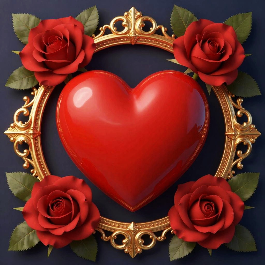 Digital art of a vibrant, glossy red heart with a shiny white highlight at its center. The heart is encircled by an ornate, gold filigree frame with intricate swirls and patterns. Surrounding the heart are lush, detailed red roses with green leaves. The dark blue background adds contrast, making the heart and roses stand out. The overall style is elegant and romantic.