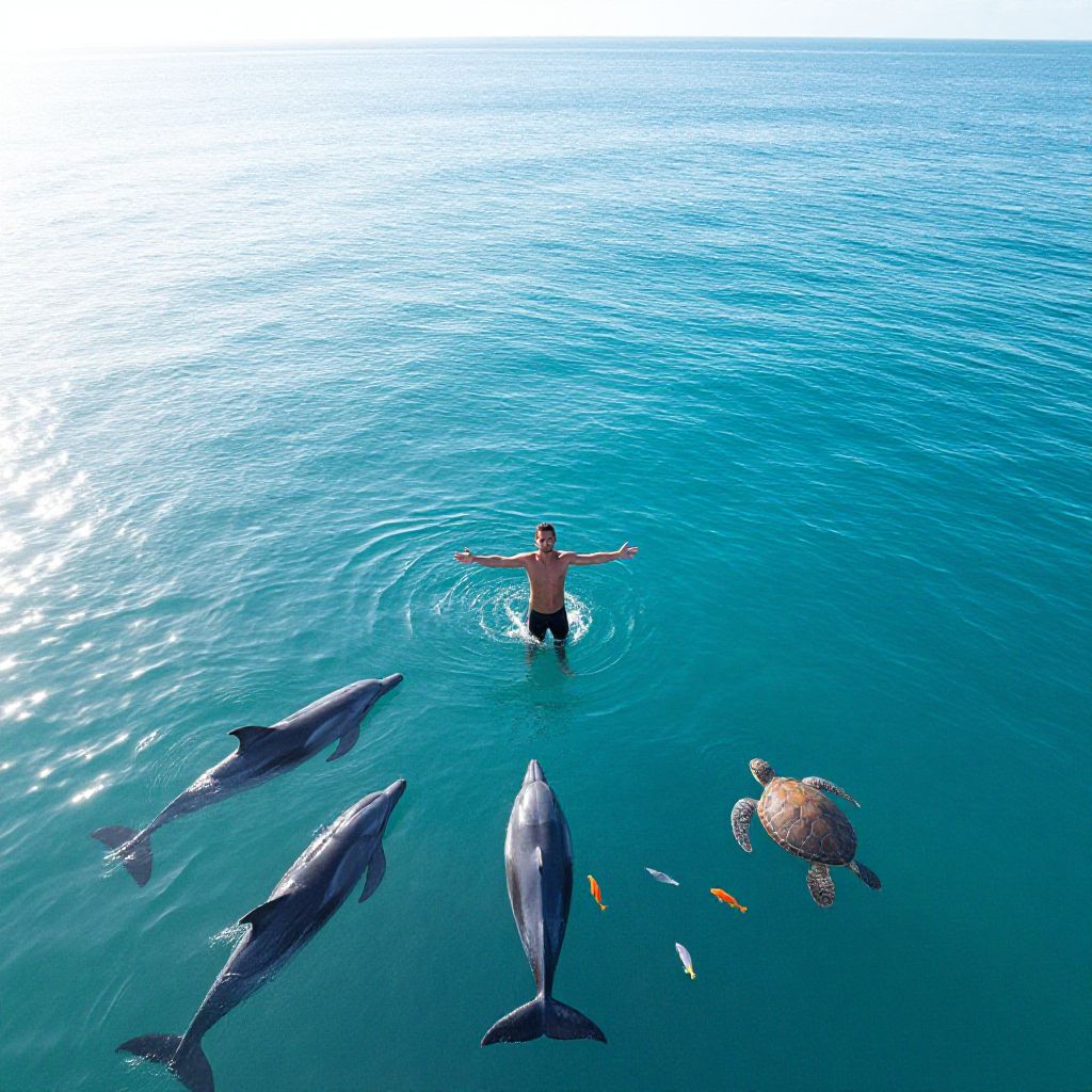 Photograph of a shirtless man with a medium build and light skin, standing waist-deep in clear, blue ocean water, arms outstretched. Surrounding him are five dolphins swimming in a semi-circle, one large sea turtle with a brown shell on the right, and several small orange fish. The water is calm with gentle ripples, and sunlight reflects off its surface. The man's black swim trunks contrast with the vibrant blue of the sea. The background is a vast, open ocean, with no visible land or sky. The image exudes a sense of tranquility and connection with marine life.