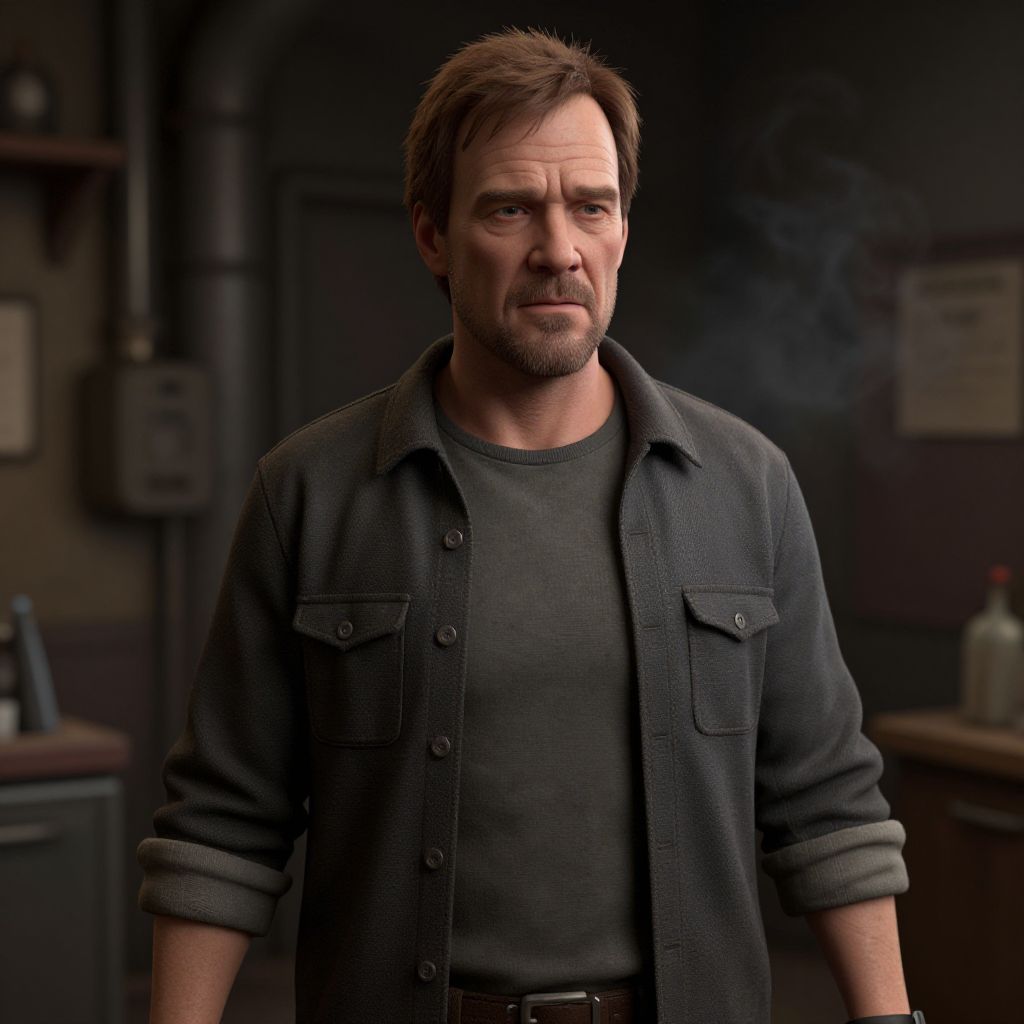 This is a realistic CGI image of a middle-aged man with short, slightly messy brown hair and a light beard. He has a serious expression and is wearing a dark gray, long-sleeved button-up shirt over a matching dark gray t-shirt. The background is dimly lit, showing an industrial setting with dark walls, a pipe, and a shelf with a few items, including a bottle. The man's shirt has two chest pockets, and he stands with his arms slightly relaxed at his sides. The lighting casts soft shadows, emphasizing his facial features and the texture of his clothing.