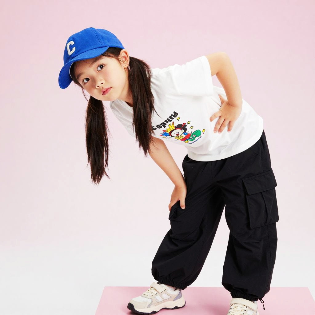 Photograph of an Asian girl with light skin, long black pigtails, and a slight tilt to her head. She wears a blue baseball cap with a white letter "C," a white T-shirt with a colorful cartoon graphic, and black cargo pants. She also has white sneakers with black soles. The girl is leaning forward slightly, with her hands resting on her thighs. The background is a solid light pink, and the overall image has a high-contrast, almost neon-like effect, emphasizing the colors and textures of her clothes and accessories.
