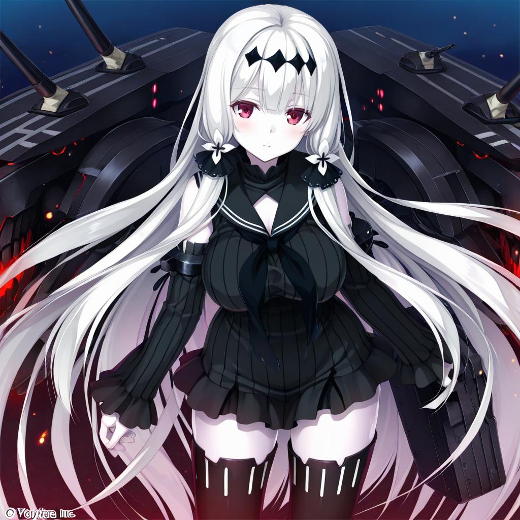 Aircraft carrier water oni, kantai collection, 1girl, white skin, red eyes, white hair, very long hair, long hair, hair ornament, large breasts, armor, short dress, ribbed dress, sailor dress, black dress, detached sleeves, zettai ryouiki, by artist ancesra, anime