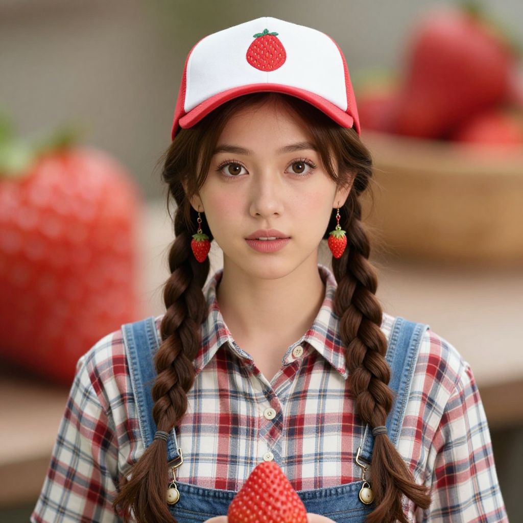 Strawberry farmer costume, 1girl, solo, plaid shirt, braid, earrings, twin braids, jewelry, looking at viewer, hat, brown hair, shirt, long hair, blurry background, plaid, realistic, overalls, brown eyes, fruit, blurry, upper body, red shirt, food
