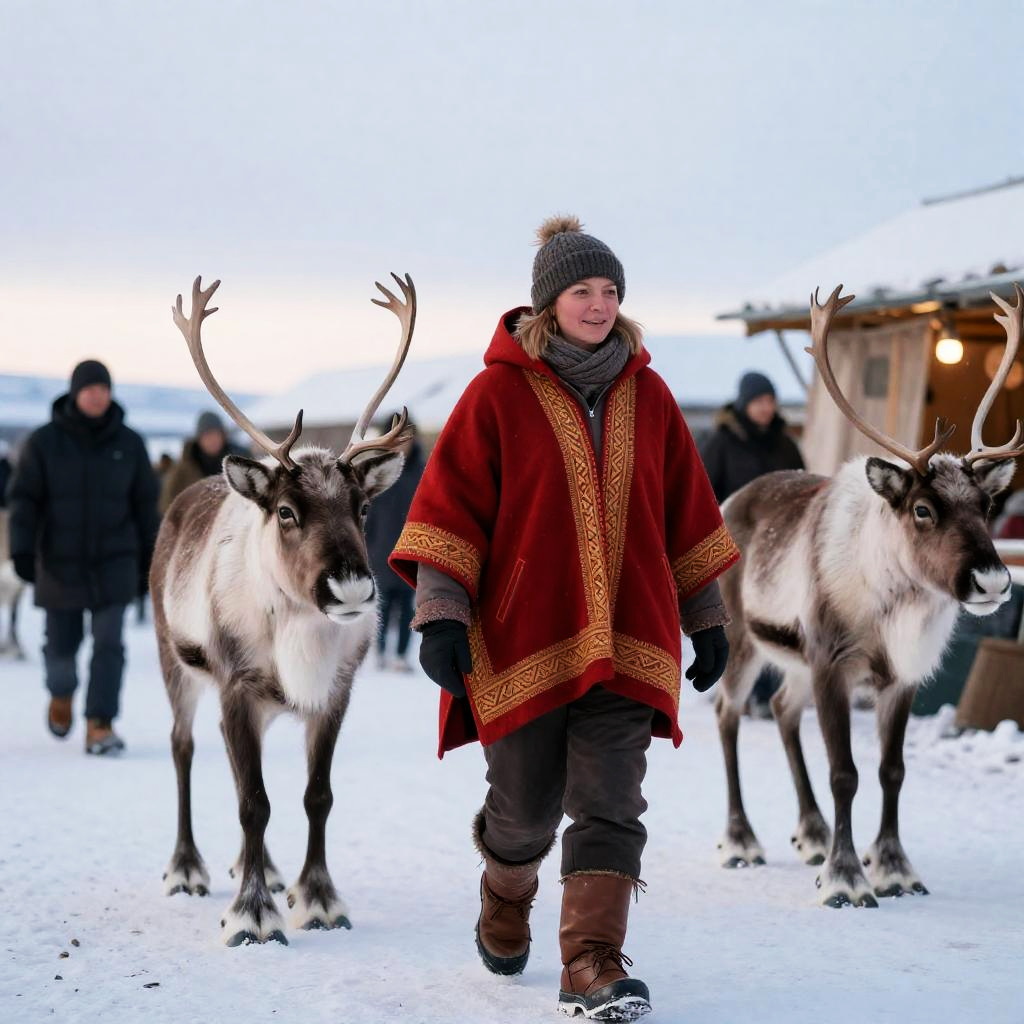 Sami reindeer herder woman in a crimson with golden trim poncho with ethnic patterns, strolling through a snow-dusted Arctic reindeer market at dusk
