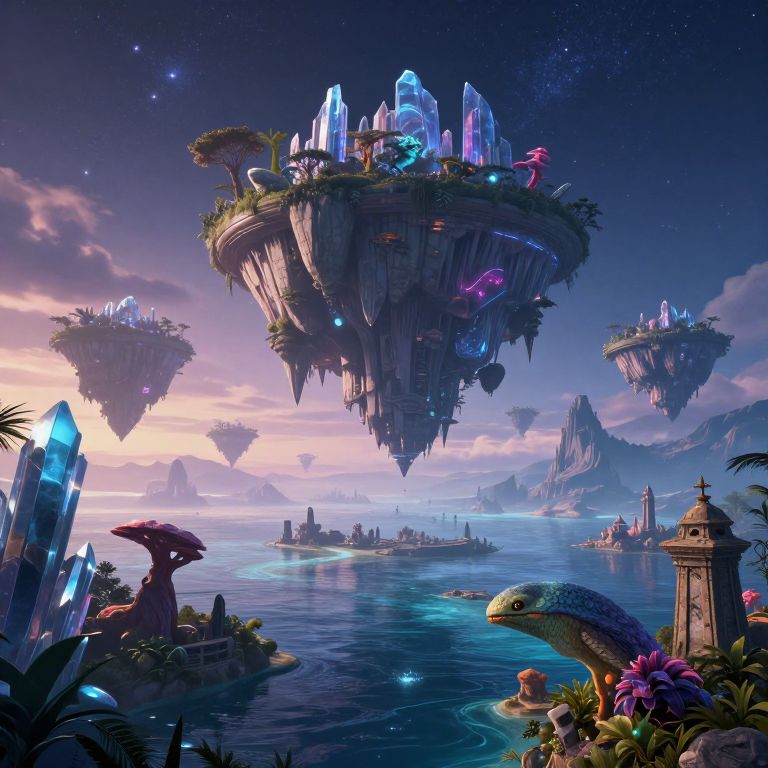 Fantasy CGI: floating crystal islands with glowing crystals, vibrant flora, exotic creatures, and a serene, starry sky over a mystical ocean.