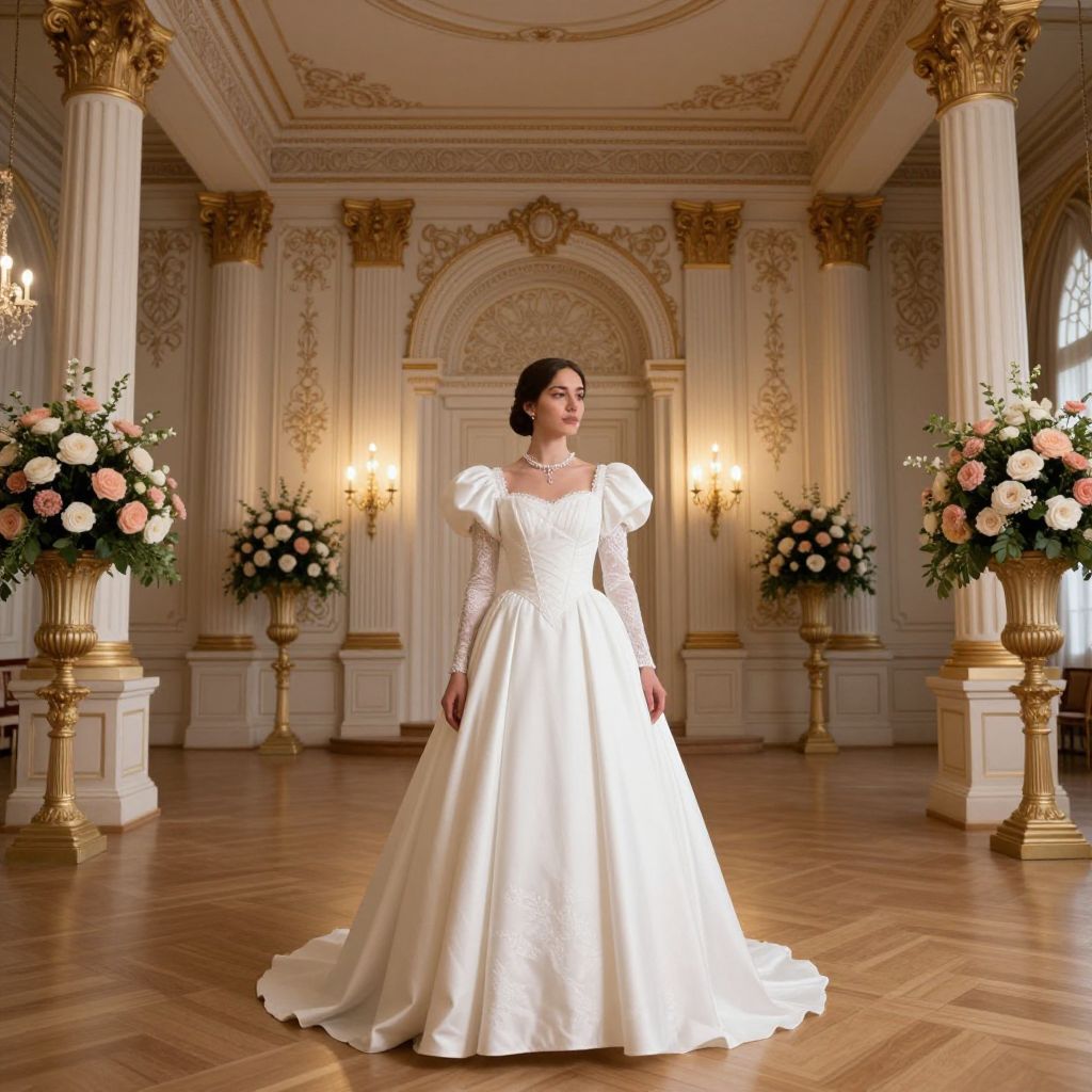 Photograph of a bride standing in an opulent, grand ballroom. She wears a white, Victorian-style wedding gown with puffed, lace sleeves and a fitted bodice. Her dark brown hair is styled in an elegant updo. The ballroom features ornate, gold-accented columns, intricate ceiling moldings, and warm, ambient lighting from wall sconces. Large, gold urns with lavish floral arrangements of pink, white, and green flowers are positioned symmetrically in the background. The wooden parquet floor adds a touch of classic elegance to the scene. The bride's serene expression and poised stance contrast with the lavish, baroque-style decor around her.
