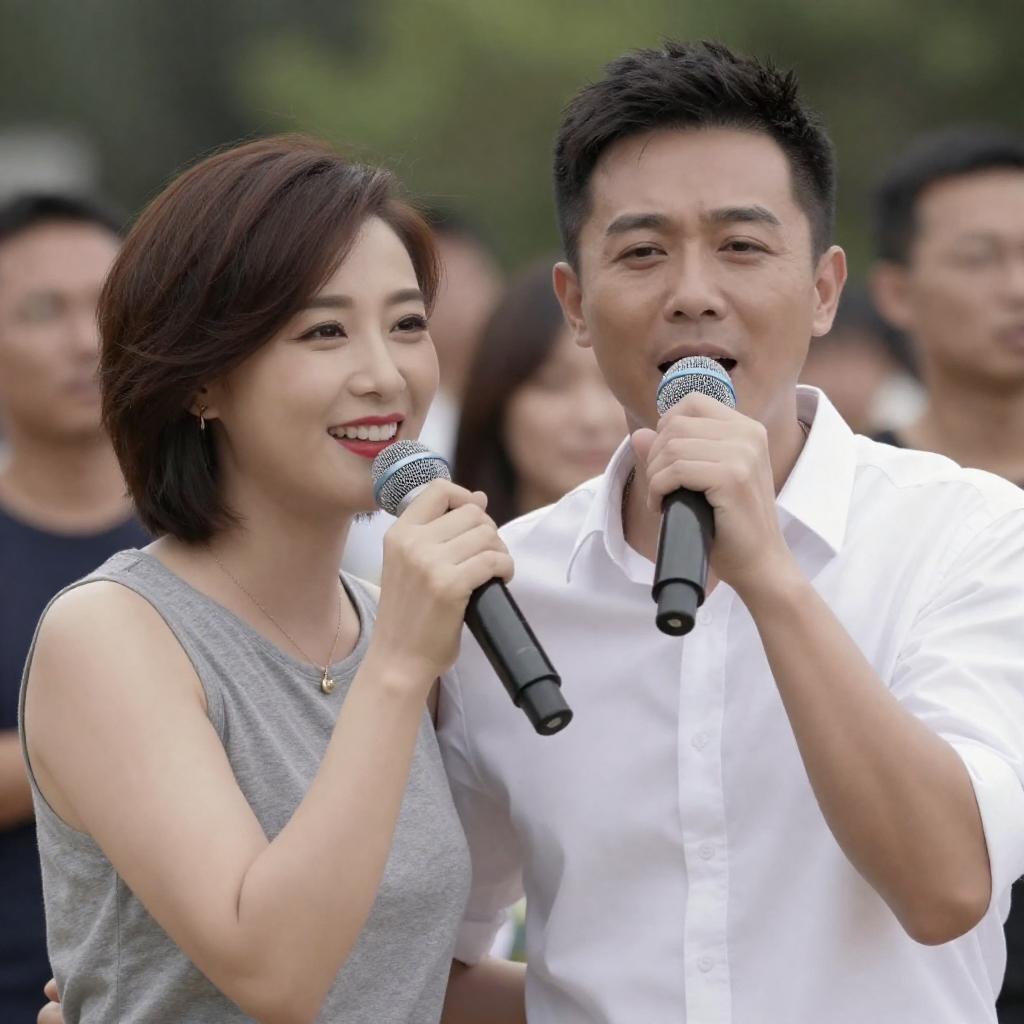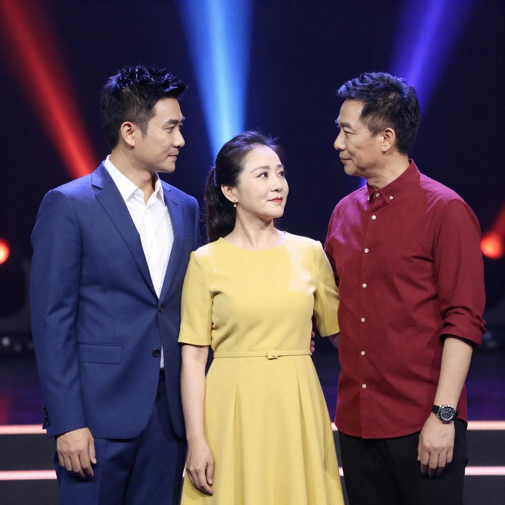 Photograph of three people on stage. Man in blue suit on left, looking at man in red shirt on right. Woman in yellow dress in center, looking at man in blue suit. Background: colorful bokeh lights, vertical light beams.