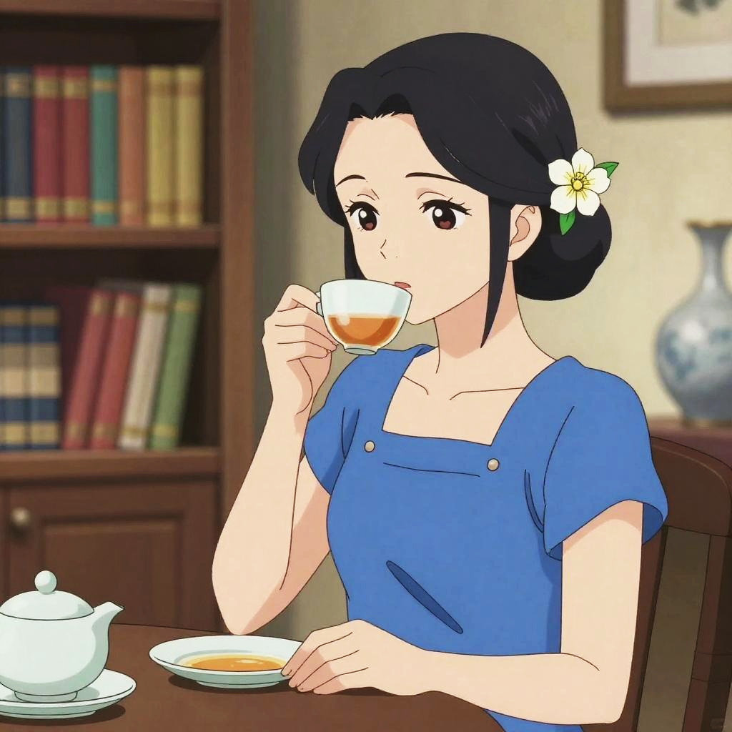 Anime style illustration of a woman with black hair adorned with a white flower, dressed in a blue outfit, sipping tea in an elegant room featuring a wooden bookshelf and a white porcelain tea set on the table.