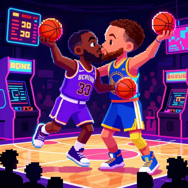 Did LeBron kiss Curry portrayed in retro 80s neon arcade style, pixel art characters resembling basketball stars in exaggerated action poses, vibrant neon colors with glowing effects, arcade basketball court with pixelated crowd and scoreboard, energetic and fun vibe