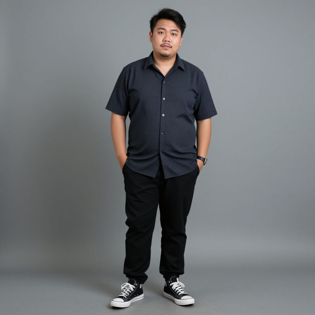 Photograph of an Asian man standing against a plain gray background. He has short black hair and a medium build with a slightly chubby physique. He is wearing a dark blue, short-sleeved, checkered button-up shirt, black pants, and black and white sneakers. His hands are in his pants pockets, and he has a neutral expression on his face. The lighting is even, with no shadows, highlighting his casual attire and relaxed posture. The overall style is simple and straightforward, focusing on the subject without any additional elements or distractions.