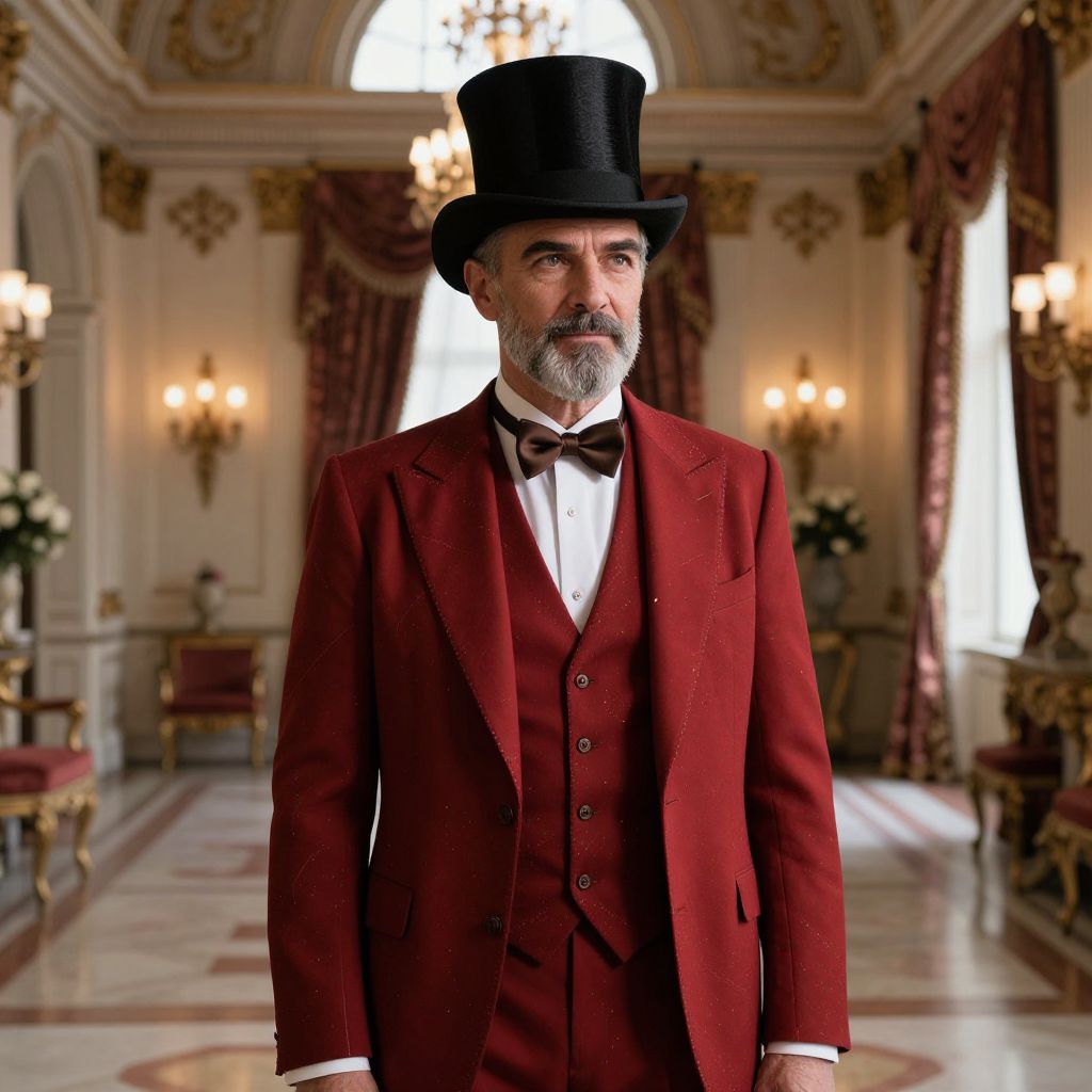 A distinguished man in his late 40s stands in a grand, elegant setting such as a historic ballroom or a luxurious mansion hall, wearing a impeccably tailored red suit with subtle gold thread detailing, a sleek black top hat with a refined crest, and a rich brown bow tie that adds a touch of sophistication. His posture is confident and refined, with a sharp yet warm facial expression that conveys intelligence, timeless charm, and quiet authority. His eyes are deeply thoughtful, framed by well-groomed dark eyebrows and a neatly combed silver-gray beard. The lighting is soft and warm, coming from a large window above, highlighting the textures of his suit, the fine weave of the top hat, and the subtle reflections on the polished marble floor. The background features ornate chandeliers, velvet drapes, and vintage furniture, creating a timeless, classic atmosphere that feels both nostalgic and elegant. The overall mood is dignified, poised, and inviting, capturing a moment of quiet elegance and refined presence.