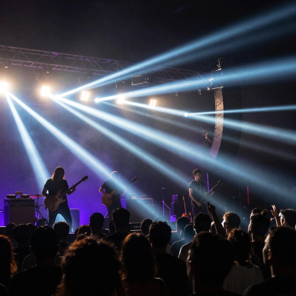 A strobe-lit concert stage during a rock performance, dynamic light beams in blues and whites sweeping over the crowd, energetic atmosphere with musicians silhouetted against bright flashes, smoky air and vivid color contrasts enhancing dramatic intensity.