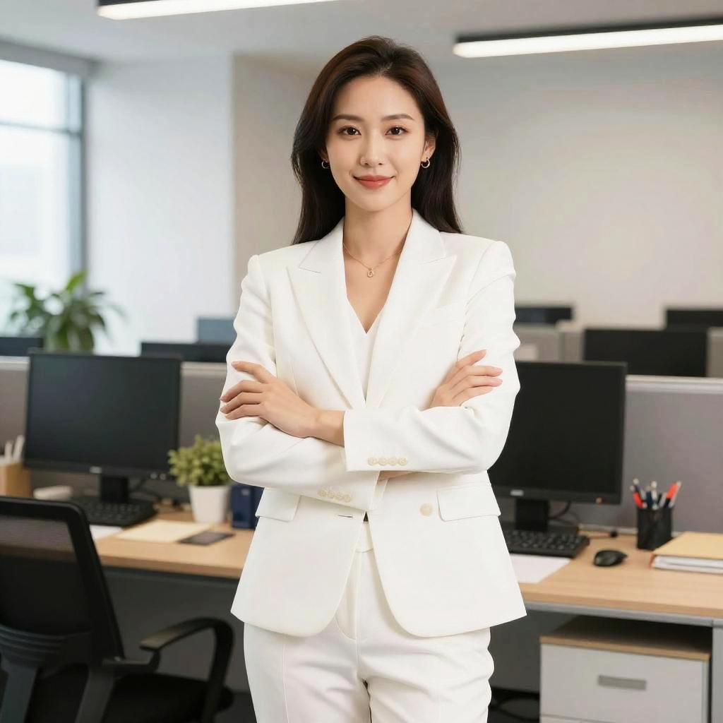 Portrait of an Asian woman standing confidently in a modern office setting, wearing a white blazer and matching pants. She has her arms crossed and is looking directly at the camera, exuding professionalism. The office background features desks, computers, and office chairs, with neutral colors and bright lighting.