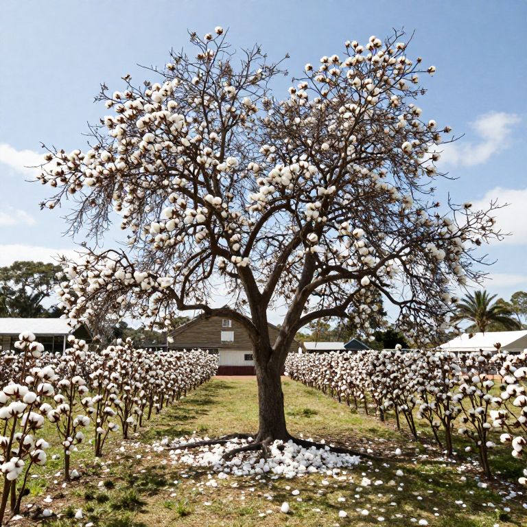 Photograph of a blooming cotton tree in a sunlit field. The tree, centered in the image, has dark brown, thick branches covered with clusters of white cotton bolls. Surrounding the tree are rows of cotton plants, also laden with white cotton. In the background, a modest brown house with white-trimmed windows sits on a grassy hill, under a bright blue sky with scattered white clouds. A palm tree is visible on the right edge, adding to the rural setting. The image has a slightly surreal, high-contrast style, emphasizing the white cotton against the vivid blue sky.