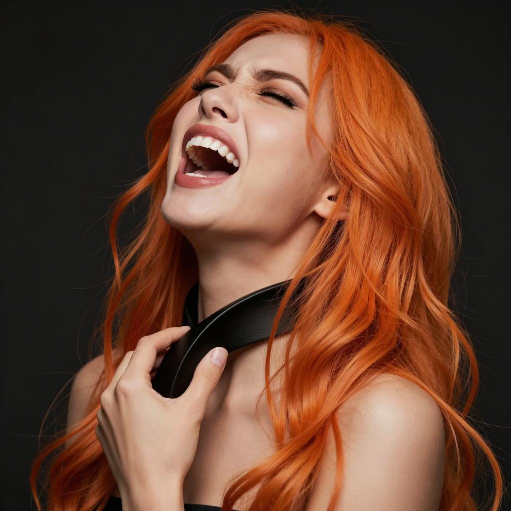 Photograph of a woman with long, wavy, orange hair, head tilted back, mouth open in a scream. A large, black, curved object is near her neck. A hand with a rough ure holds the object. Black background.