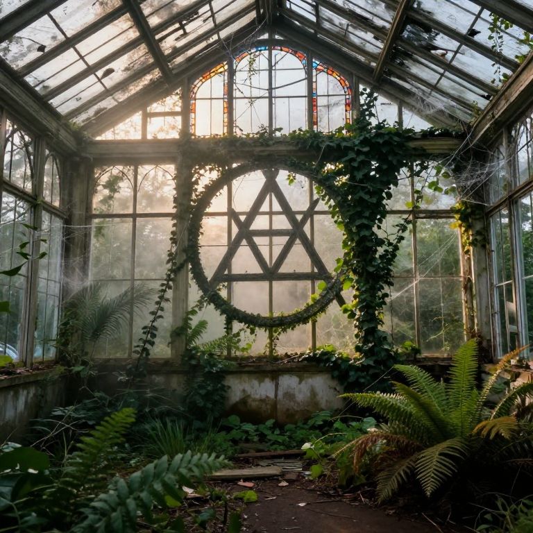 The image depicts an abandoned, ruined greenhouse with a pentagonal esoteric symbol covered in ivy and mist. The structure is adorned with numerous cobwebs and is overgrown with various plants, including ferns and bushes. Sunbeams filter through the stained glass windows, casting a warm glow on the decaying walls. The greenhouse's roof is partially collapsed, allowing the elements to further deteriorate the structure. The overall composition is a blend of natural and man-made elements, creating a sense of decay and abandonment.