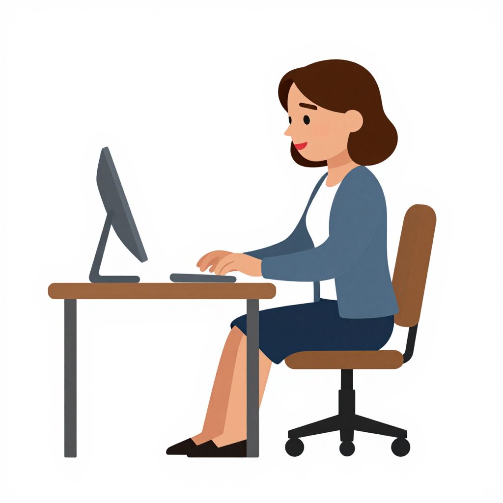 Digital illustration of a brown-haired woman in a blue jacket, white blouse, and black skirt, seated at a desk, typing on a computer.