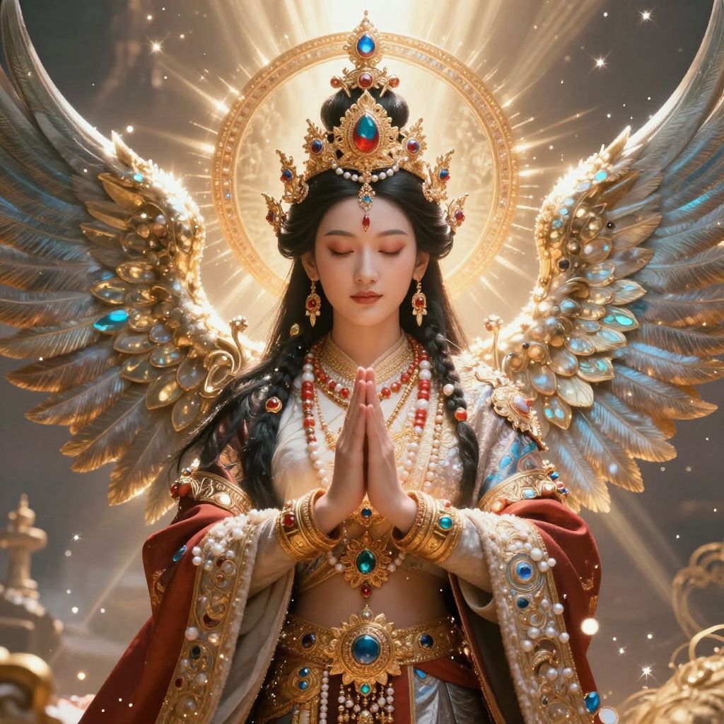 A portrait of a gorgeous female tibetan goddess, divine supreme majestic wings halo sparkling gems being sending out magical blessings healing joy, 100k resolution, perfect masterpiece, intricate artwork hyperdetailed Unreal Engine fantasy sunshine rays radiant; photo realistic