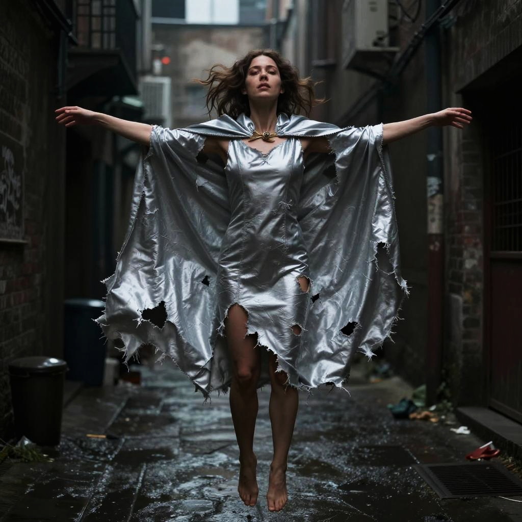 Realistic photo.A woman floating with arms outstretched, wearing a damaged silver cape, in a shadowy backstreet. Hyper-detailed, realistic, dramatic and gritty atmosphere realistic photo