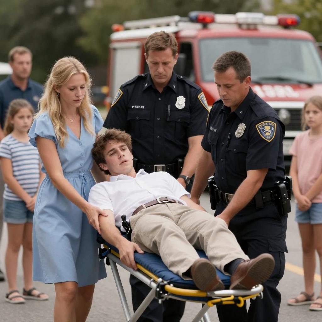 A young man wearing a white shirt and beige pants lies on a stretcher being carried by two male police officers in dark uniforms and a blonde woman in a light blue dress. Several bystanders, including children, watch with concern. A fire truck is visible in the background, indicating an emergency or accident scene in an outdoor setting.