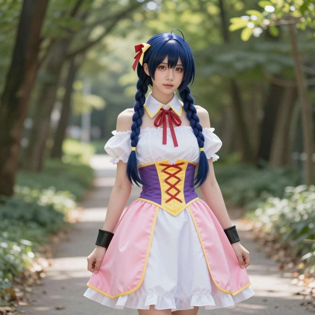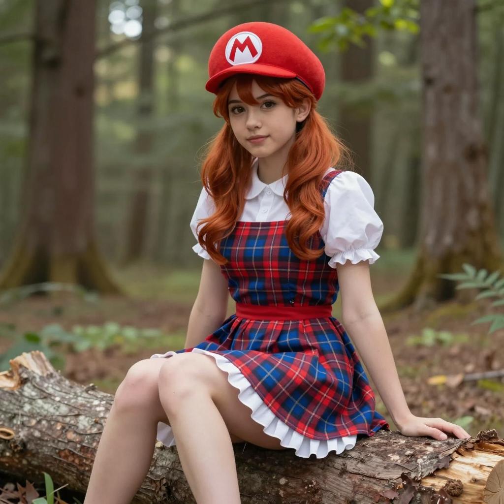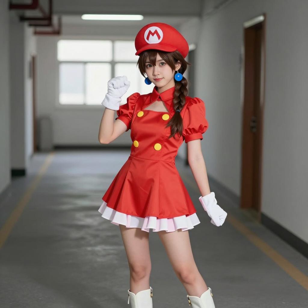 Super mario woman costume, photo of a woman, mario cosplay, standing in a dimly lit hallway, wearing red hat with white mario , red dress with yellow buttons, pink skirt, white gloves, white boots, blue earrings, brunette hair in braid, hand raised in a fist, bright natural light from window in background, slightly blurred background, realistic style, playful and cute, full body shot