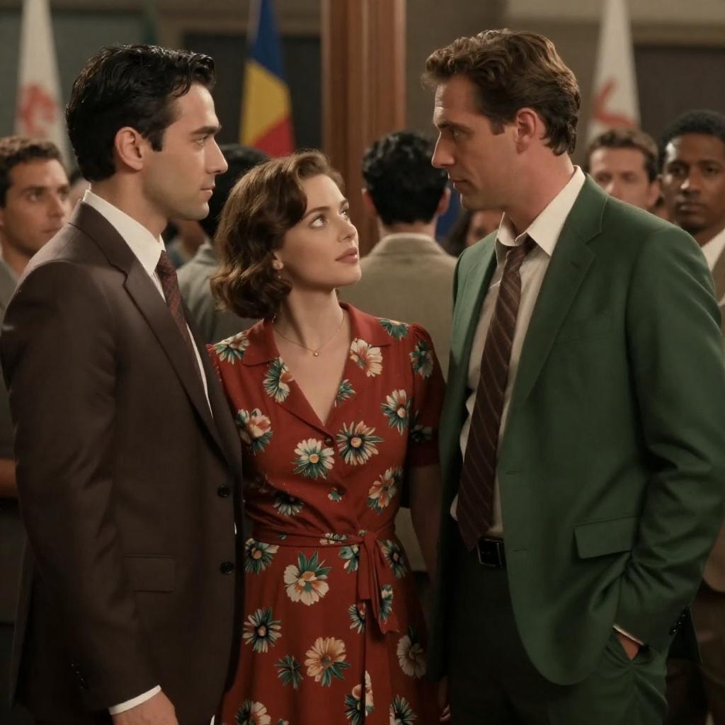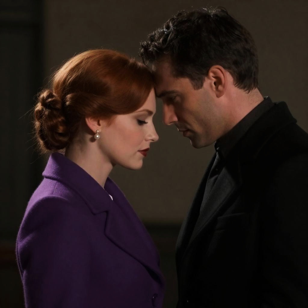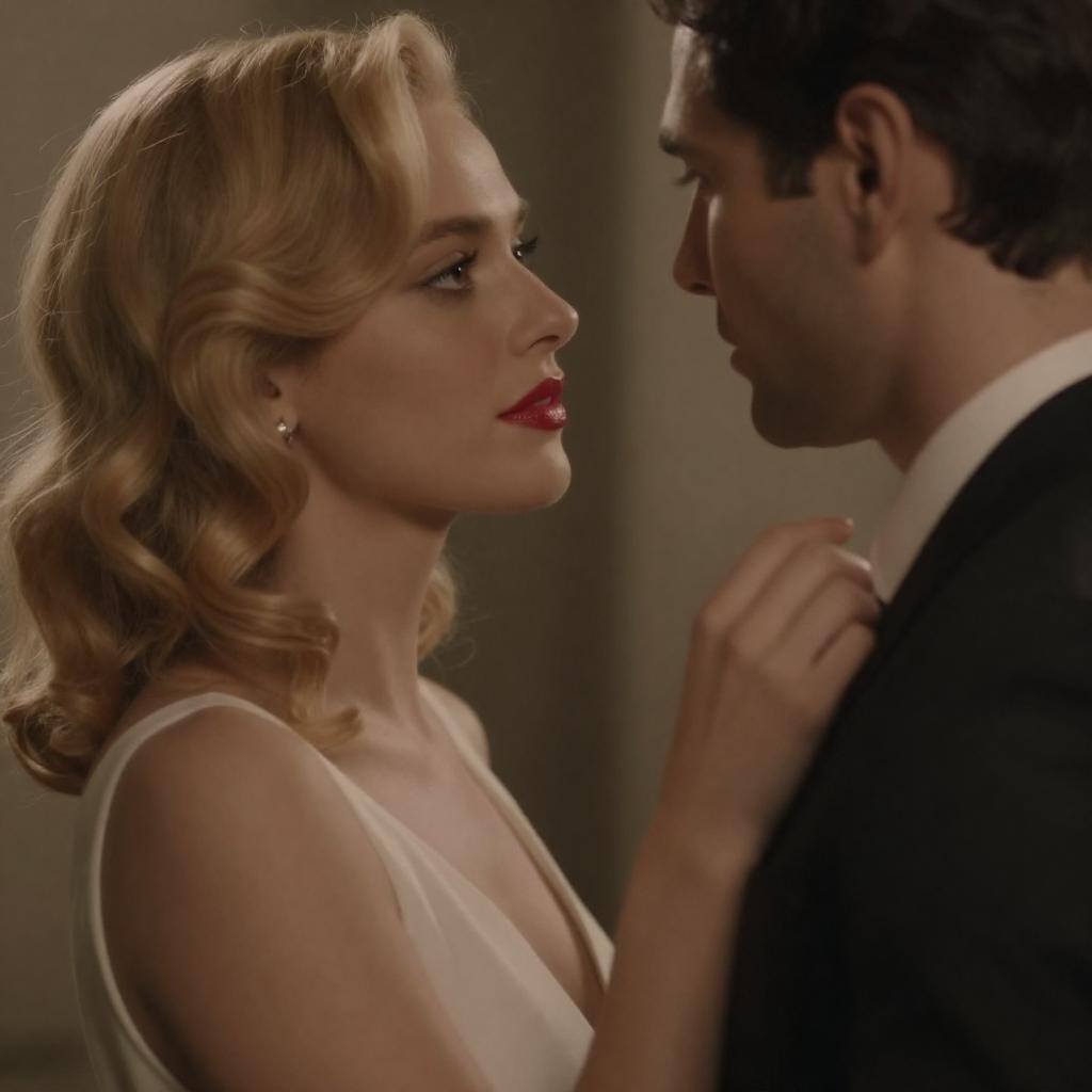 Movie poster of "Woman's Man" showing a blonde woman with curled hair, red lipstick, and a dark blue coat, looking up at a man with dark hair and a blue turtleneck, leaning close to her. Two headshots in the background.