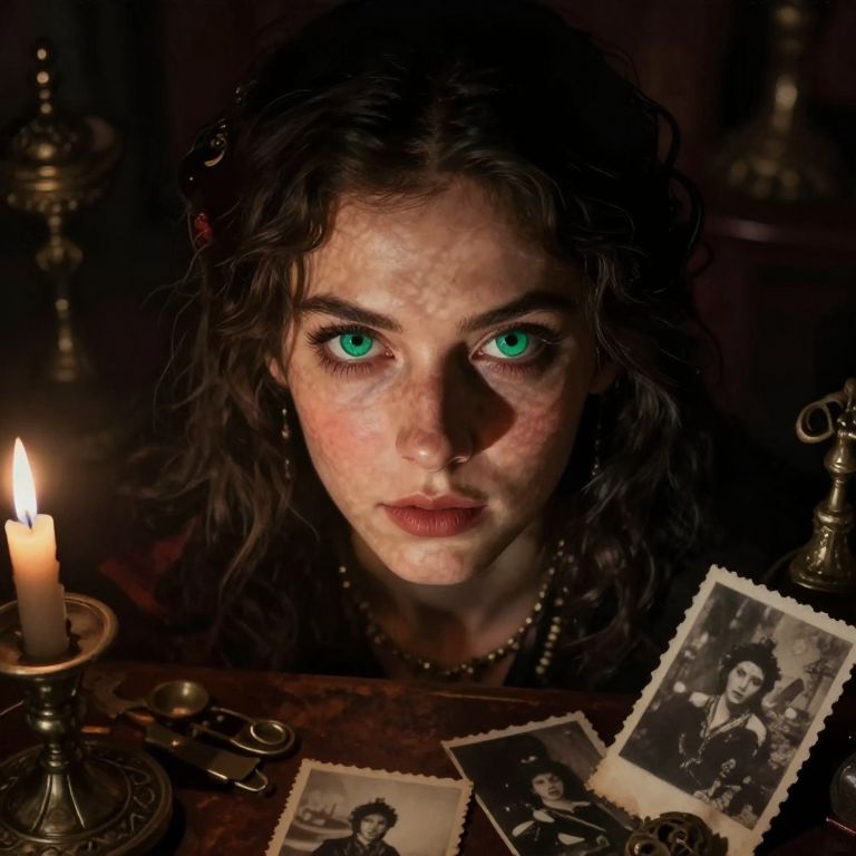 A digitally edited photograph of a young woman with intense green eyes, curly dark hair, and freckles, illuminated by a single lit candle on the left. She wears a necklace and is surrounded by old, sepia-toned photographs of herself and others on a dark wooden table. The background is shadowy, creating a dramatic, gothic atmosphere. The candlelight casts a warm glow on her face, highlighting her focused, almost haunting expression. Scattered around the table are various small objects, including a brass clip and a paperclip.