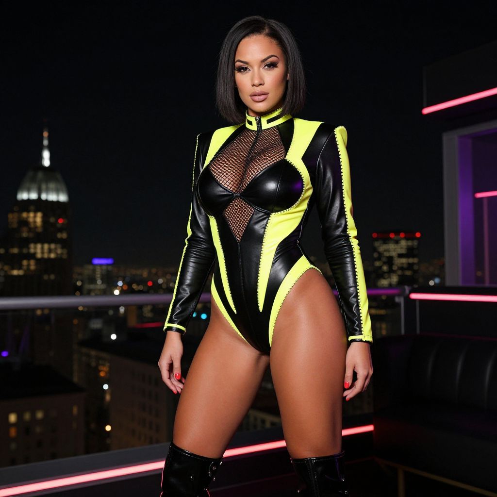 A tall, athletic woman with olive skin, short straight black hair, and a focused expression, wearing a dramatic club costume including a sleek black leather bodysuit with neon yellow geometric patterns, a mesh underlayer, and a high-heeled, ankle-boot ensemble, posed in a dimly lit rooftop club with city skyline views and ambient bass music echoing in the background.. The woman has big breasts and cute face