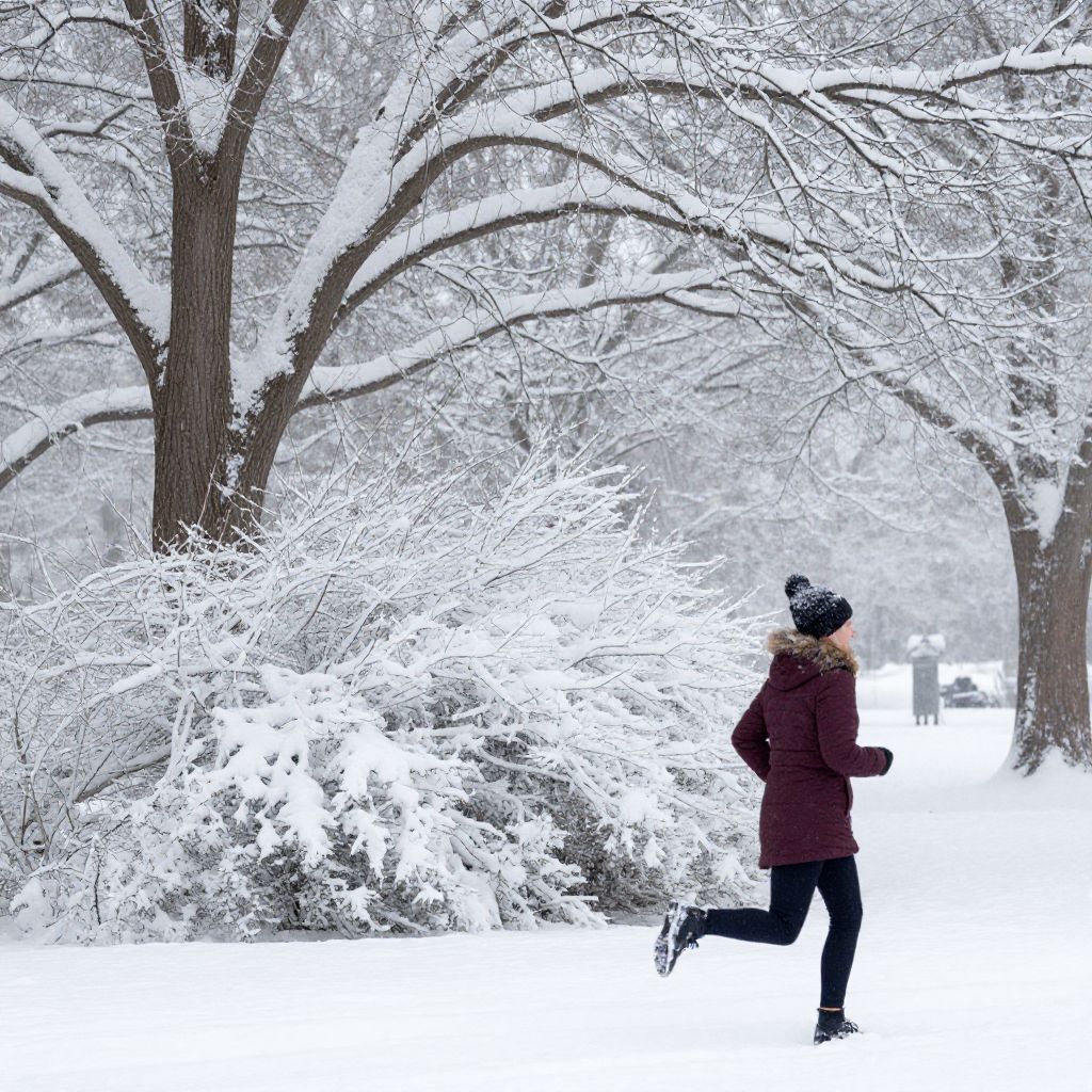 Photograph of a person in a maroon coat and black hat running through a snowy, tree-lined park with branches heavily laden with snow.