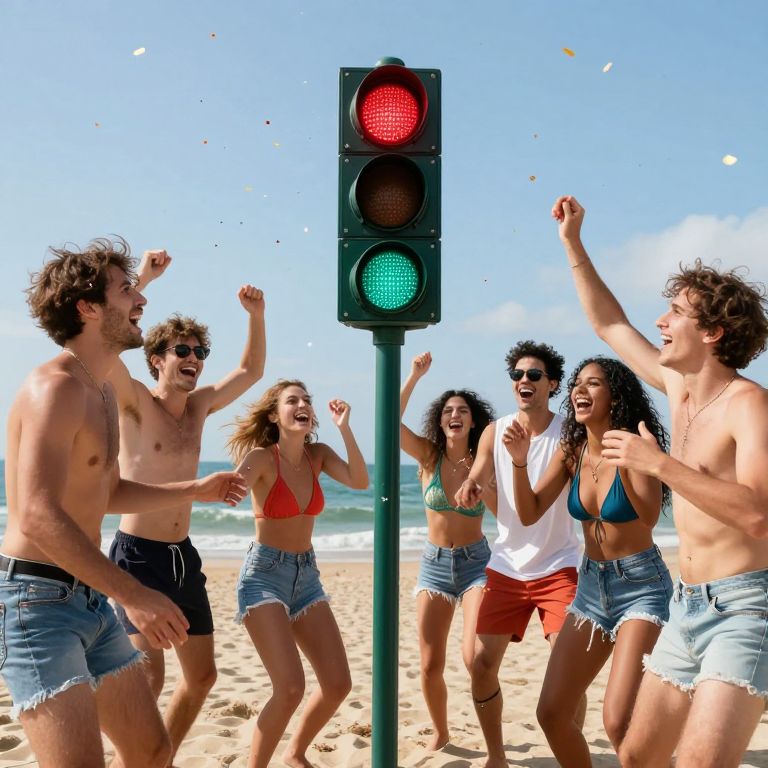 Crosshatching beach party, dinamic group photo of people celebration around a brand new traffic light, 16mm, photorealistic, confetti, happiness, crazyness,