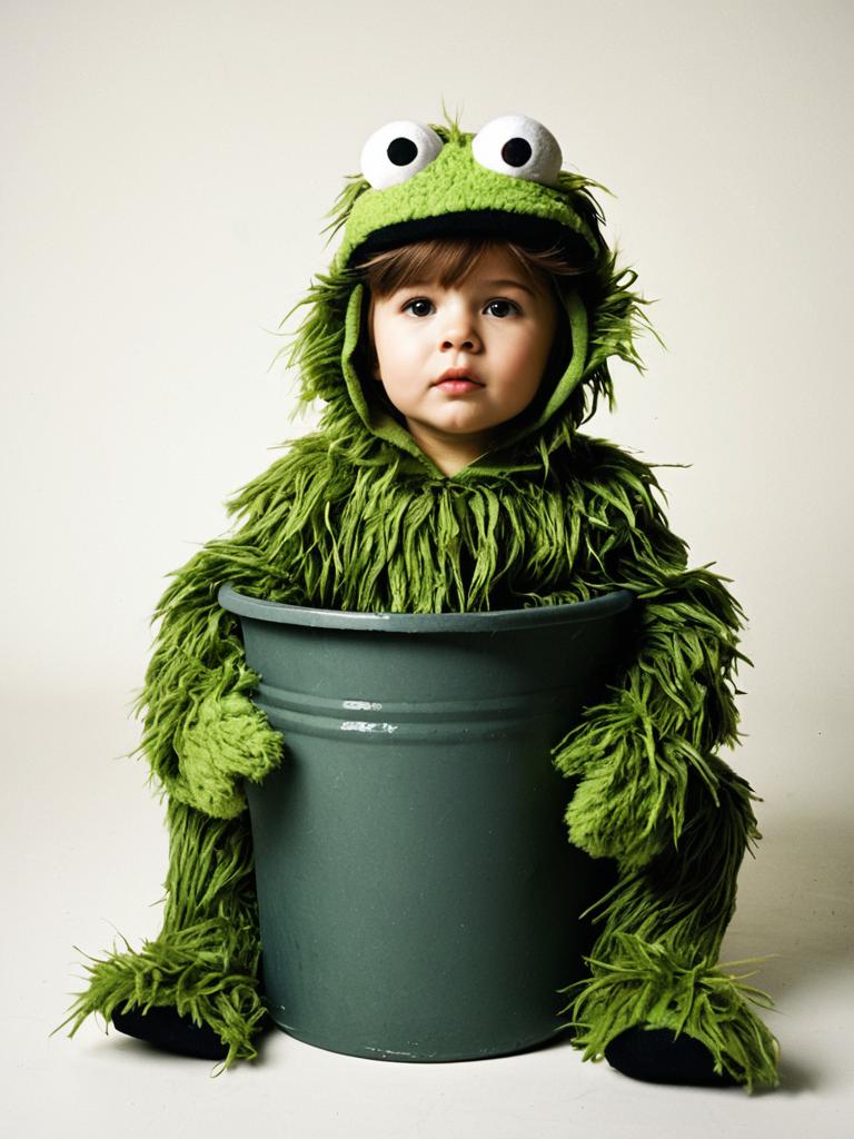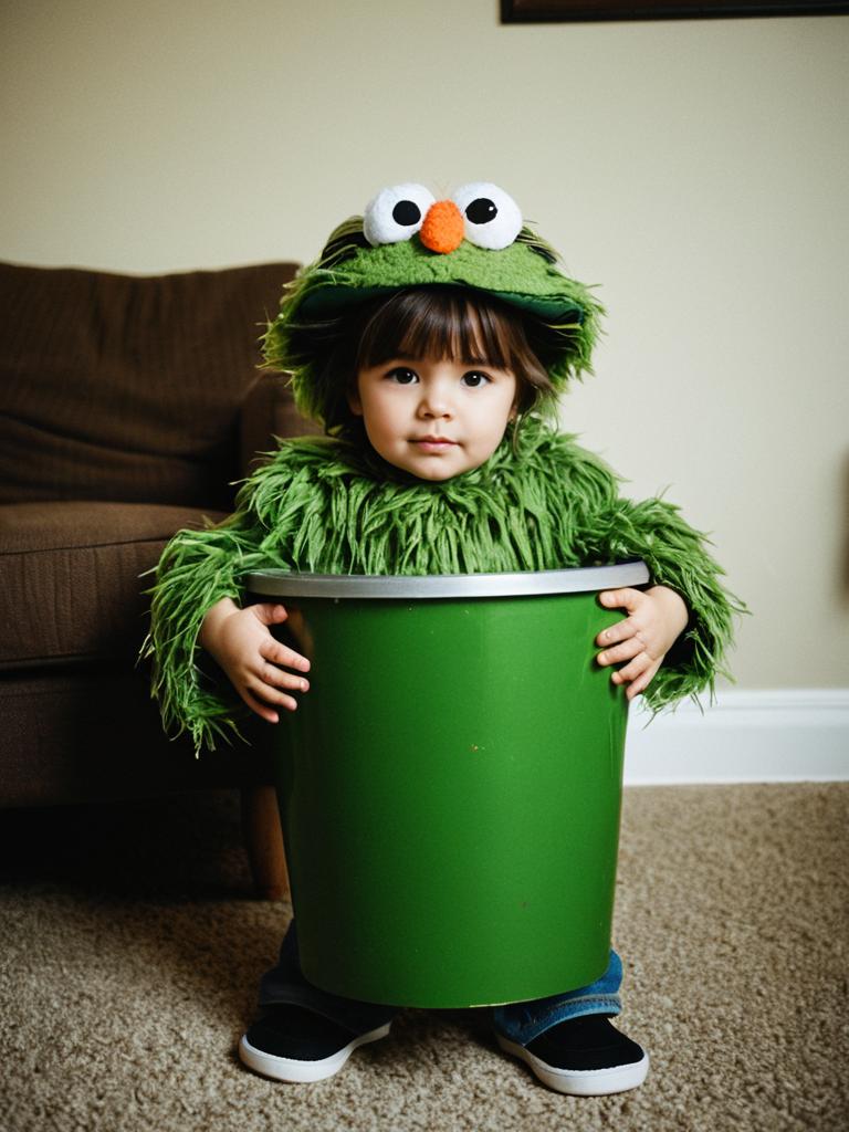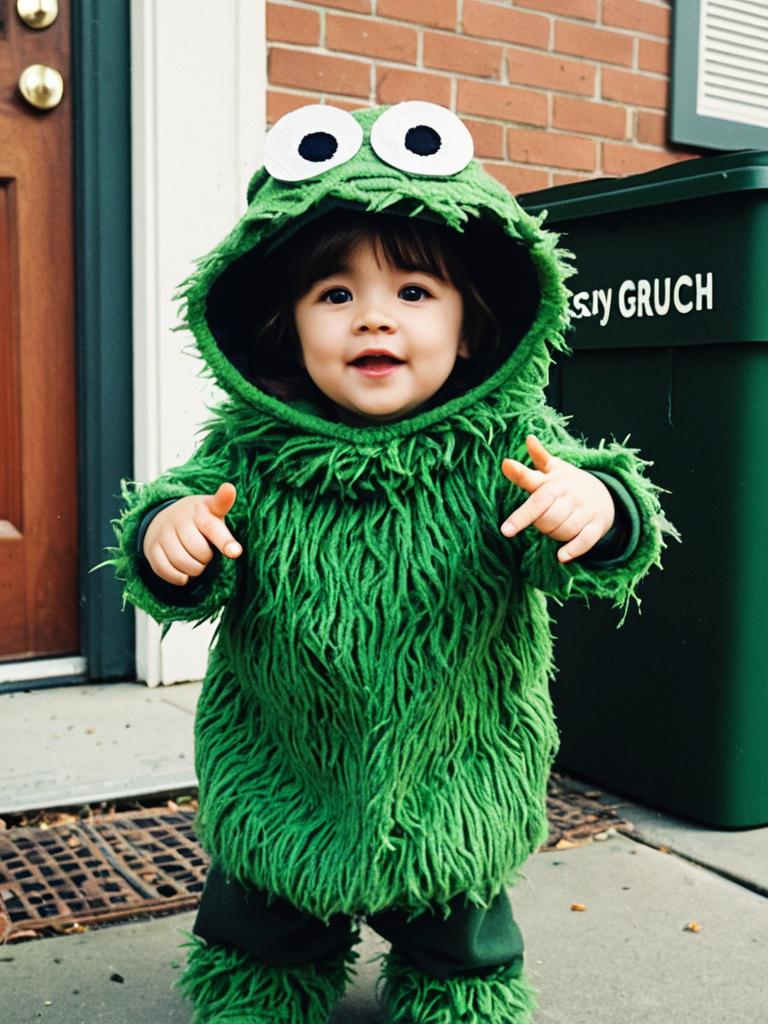 Toddler in Oscar the Grouch Costume, full-body photo in cozy setting