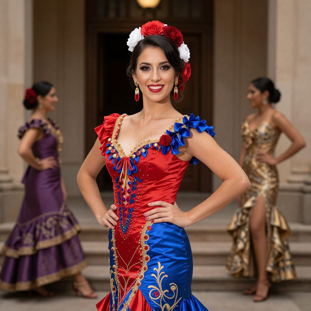 Ladies spanish fancy dress, woman in red and blue dress with flowers in her hair