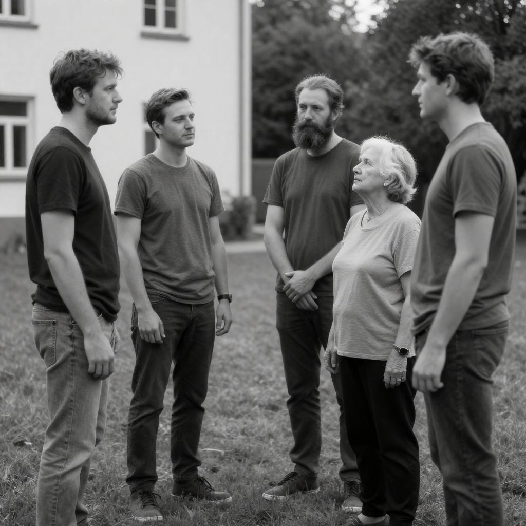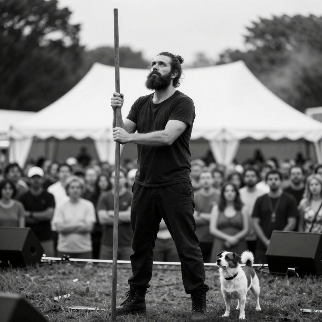 Black-and-white photograph of a bearded man in dark clothing holding a long wooden pole, standing on a grassy stage. Background crowd, large tent with smoke rising. Man looking upwards, intense expression. Small dog beside him, looking up.