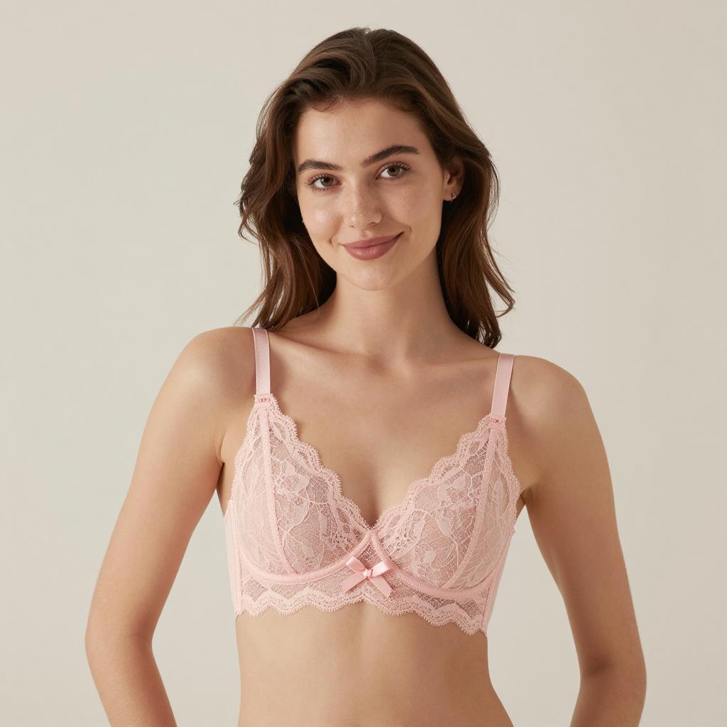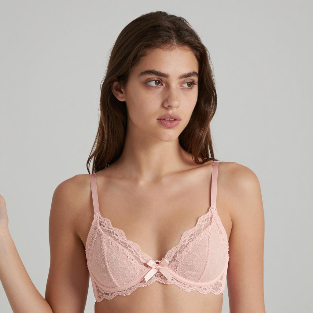 Young woman with long brown hair, light skin, and brown eyes, smiling slightly, wearing a pink lace bra with thin straps. Upper body, frontal view, neutral background. Bra has a small bow in the center. Hands by her sides. Light makeup.