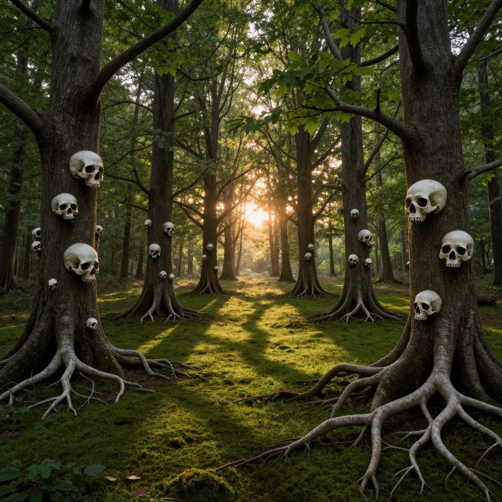 Photograph of a dense, sunlit forest with tall, dark-barked trees. Each tree trunk has multiple white human skulls hanging from its branches. The forest floor is covered in green moss, with sunlight filtering through the leaves, casting long shadows. The skulls are evenly spaced along the tree trunks, creating a surreal, eerie atmosphere. The background shows a bright, golden sunset, contrasting with the dark trees and moss-covered ground. The image has a fantastical, slightly haunting quality, with a focus on the juxtaposition of natural and supernatural elements.