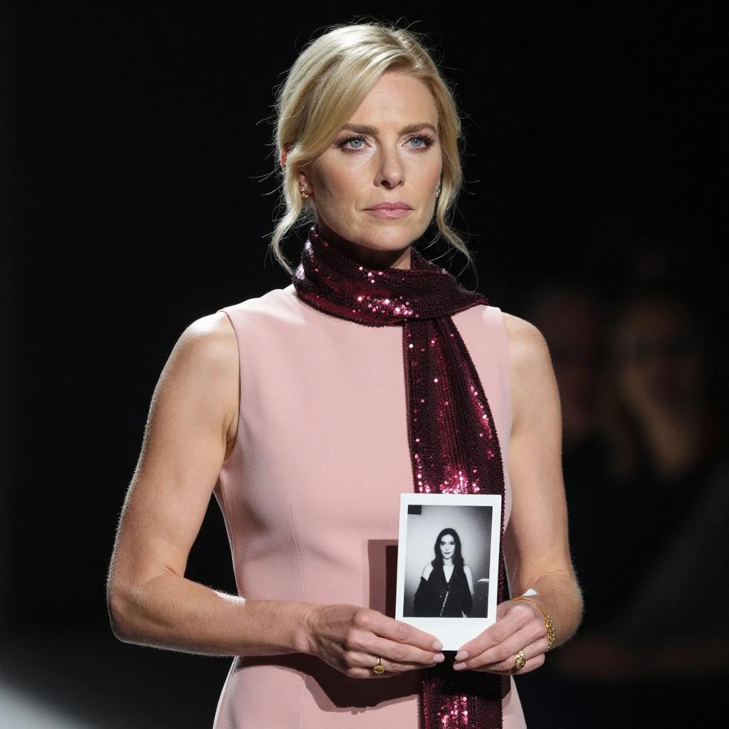 Photograph of a blonde woman with light skin and blue eyes, wearing a sleeveless pink dress and a dark red sequined scarf. She holds a black-and-white photograph and wears gold jewelry. The background is dark, with a faintly visible person on the right. Her expression is neutral, and she stands slightly forward.