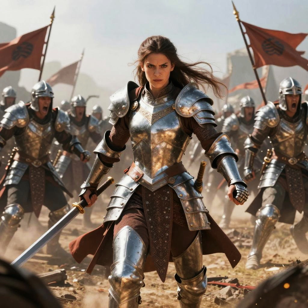 Photorealistic digital artwork depicting a fierce female warrior in medieval-style silver armor, with a determined expression, leading a charge. She has long brown hair flowing in the wind, holds a sword in her right hand, and wears a dark brown tunic under her armor. Behind her, soldiers in similar armor and red banners with black symbols follow, creating a dust cloud on a sandy battlefield. The sunlight highlights her armor's shine, adding depth and intensity to the scene. The background is slightly blurred, emphasizing her as the central figure.