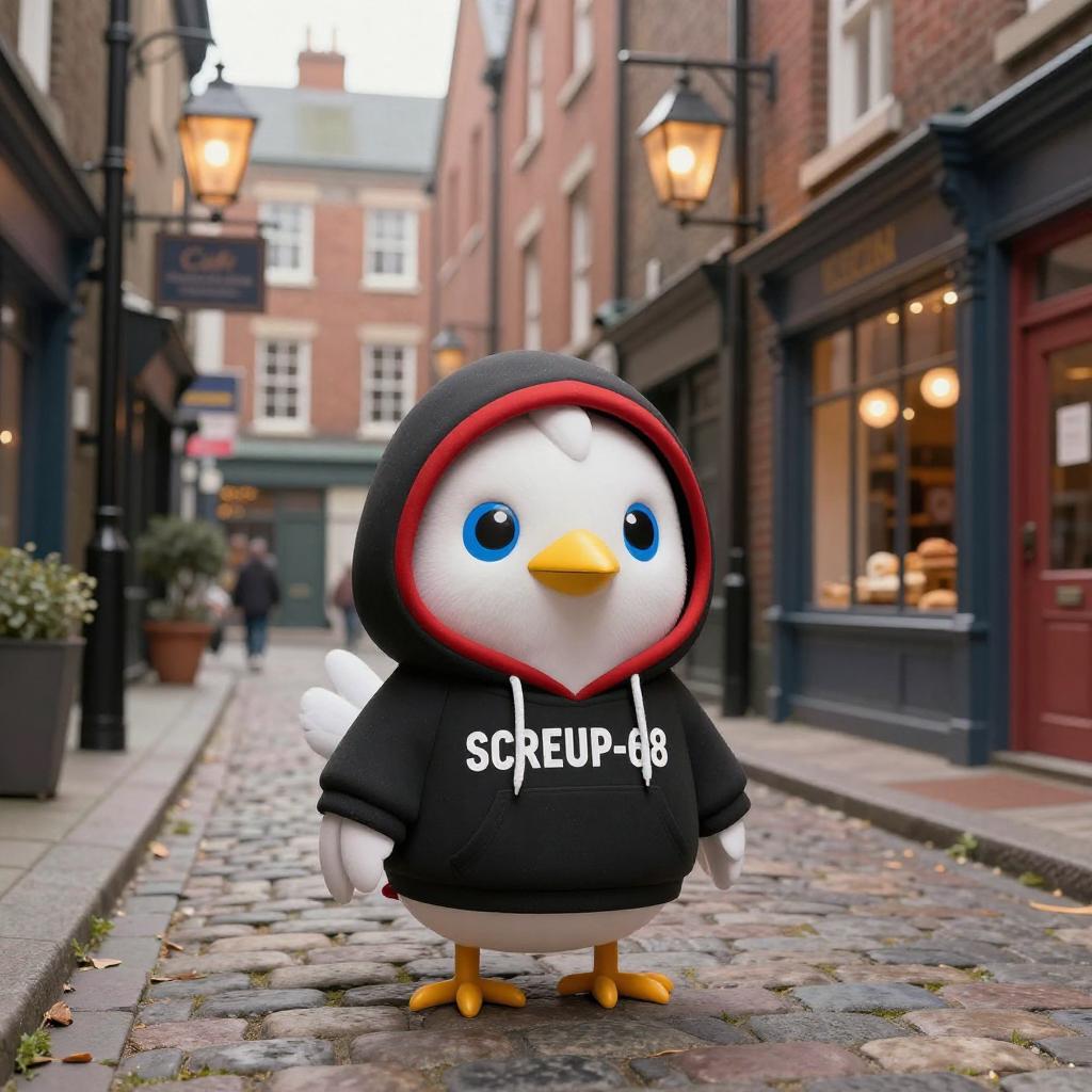 Digital artwork of an anthropomorphic white feathered bird with large blue eyes and a yellow beak, wearing a black hoodie with a red hood and the text 'SCRE UP-68'. The character stands on a narrow cobblestone street featuring brick buildings, hanging lanterns, and shop signs such as a cafe and scone shop, evoking a quaint European urban alley atmosphere.