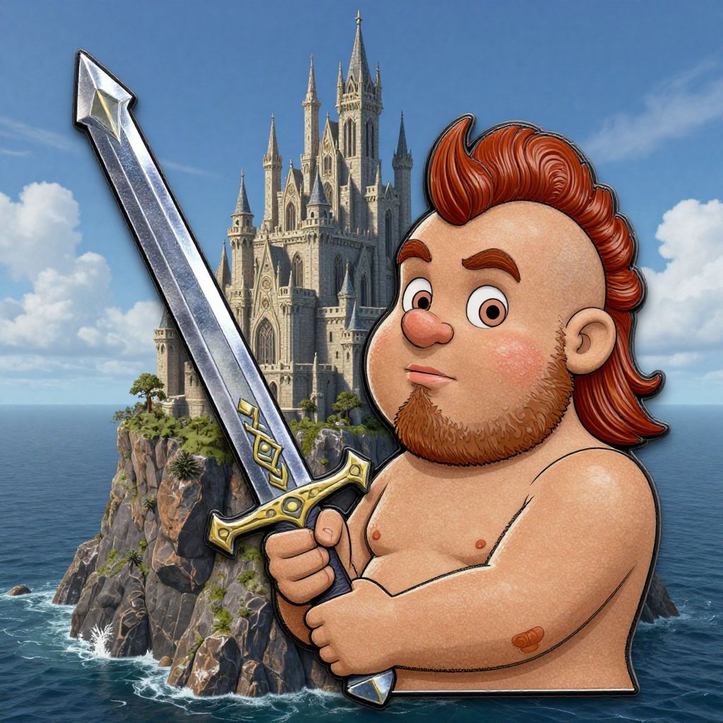 Line art trinket depicting a middle earth, Paladin wielding an enchanted sword, Maverick, Short, Chubby, Round Face, Olive Skin, Red Hair, peach Eyes, [[Curved Nose]], Thick Lips, Round Chin, Mutton Chops, Mohawk, A sprawling castle, perched high on a rocky cliff overlooking the sea, Tolkien Ueda Fumito, natural, shimmering, vibrant, gothic, rpg, 1400ad, ultra detailed, detailed, immersive, reminiscent of high fantasy RPG games, HD, masterpiece, best quality, hyper detailed, super realistic, perfect face, perfect hands, award-winning, professional, breathtaking, linquiveraflat Plateaugusty weatherprofessional 3d model . octane render, highly detailed, volumetric